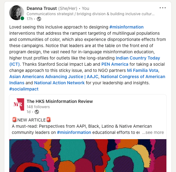 Welcome to new followers! It was great to meet some of you at the International Association of Business Communicators DC session on Tuesday, where I shared the evidence base for adopting a more relational, social change approach for curbing mis- and disinformation, plus some tips we all can use and – hopefully – inspiration for communicators, who are key players in addressing this pervasive problem. The video will be posted to IABC DC's YouTube page shortly; I'll share when it's up.