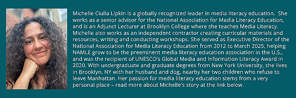 Fortunately, we now have an expert to help us sort through terms and further establish our place in the media literacy education universe. Michelle Ciulla Lipkin, who recently stepped down as executive director of NAMLE, is the inaugural member of our new Advisory Board! More about Michelle: