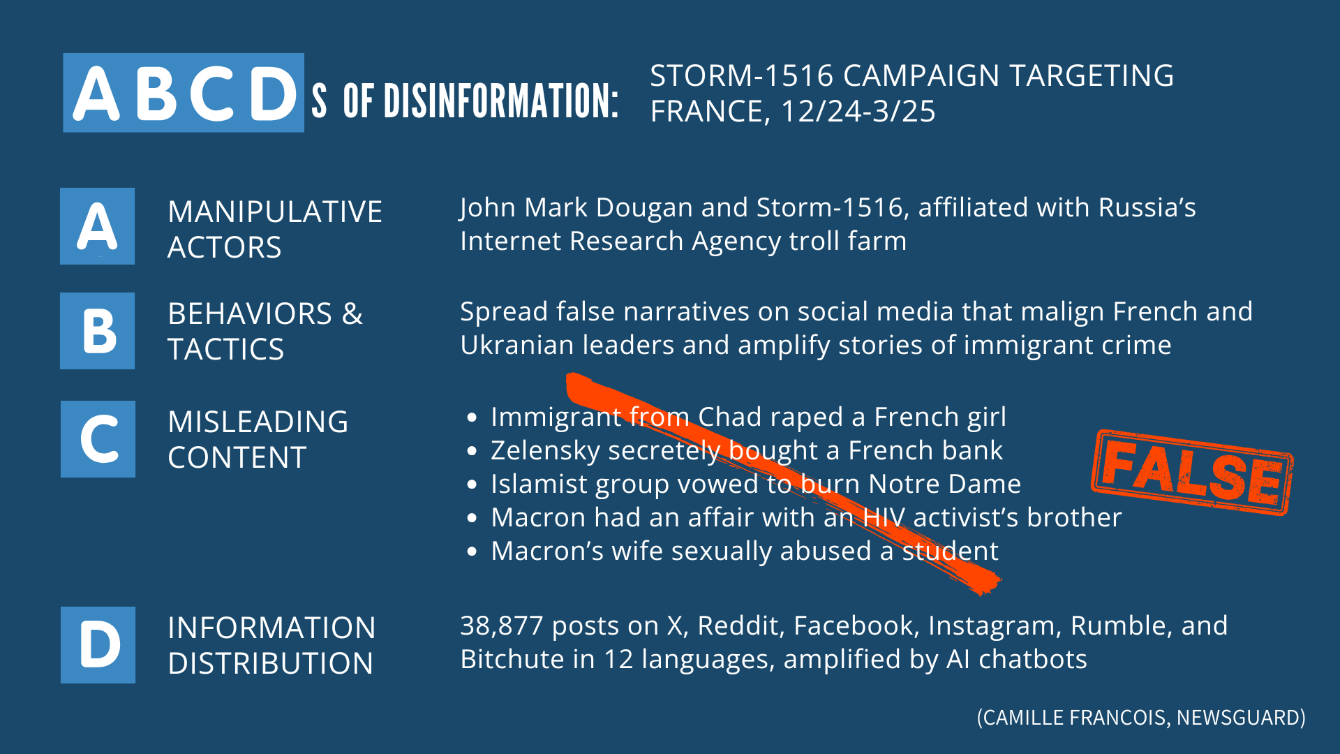 We've previously mentioned John Mark Dougan, an ex-deputy sheriff from Palm Beach who, after being investigating for hacking and extortion, fled to Moscow and now runs a huge disinformation network there. Revealed by NewsGuard reporters, Dougan's Kremlin-aligned operation, Storm-1516, spent the first quarter of 2025 amping up false narratives targeting France – just as President Macron stepped up his country's support for Ukraine, America backed off and far-right leader Marine LePen was convicted for embezzlement.