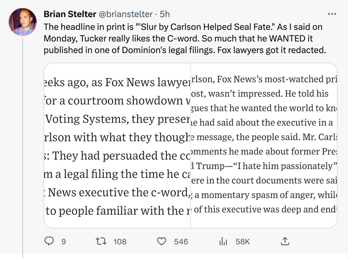 - On Twitter, Brian Stelter shared his take on Tucker Carlson's firing by breaking down a Wall Street Journal story posted an hour ago. The story is paywalled and I can no longer embed tweets 😡 so if you can't see the linked thread, here's a screengrab that gives you an inkling: