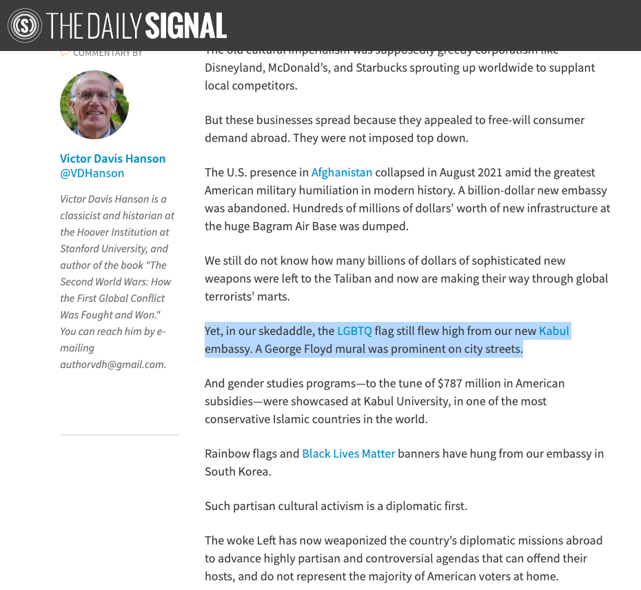 - Normally this link would be added to define LGBTQ or substantiate the claim in the sentence. Not to direct the reader to a story about LGBTQ discrimination (or simply promote additional Daily Signal content). A better choice might be the Foreign Policy piece I linked to above, which explains the cycle of banning and permitting flying Pride and similar flags on U.S. embassies.