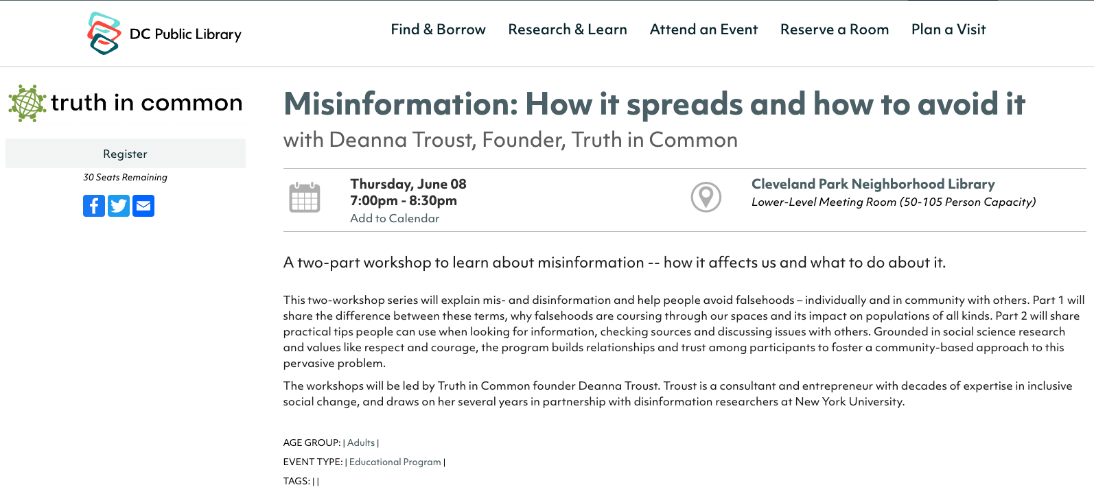 Truth in Common hits DC Public Libraries. Our first, in-person digital literacy workshop series for DC residents is set for the Cleveland Park Library on two subsequent Thursdays in June – June 8 and June 15, from 7-8:30.